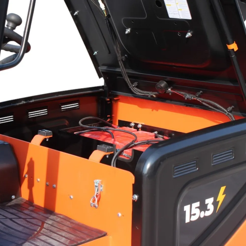 Погрузчик легко справляется с нагрузкой до 1500 кг, поднимая её на высоту до 3000 мм. Электродвигатель мощностью 3900 Вт обеспечивает стабильную работу и скорость движения до 9,5 км/ч. Свинцово-кислотный аккумулятор (60V/140Ah) гарантирует длительное время работы без подзарядки, а вес батареи (165 кг) обеспечивает устойчивость конструкции.