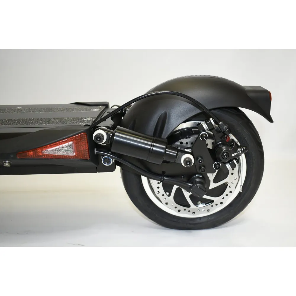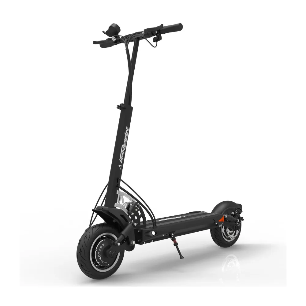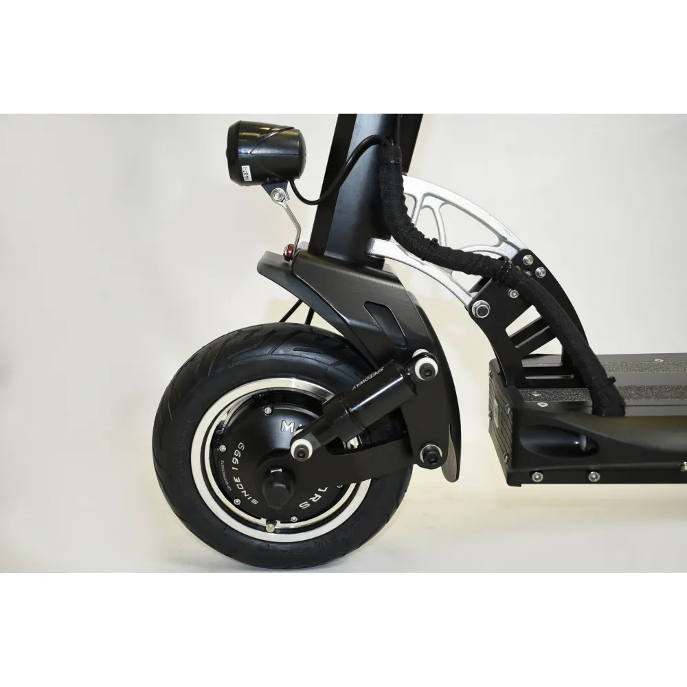 Заявленная максимальная скорость 65 км, это делает самокат скоростным, те кто любит быстрое движение, оценят. Широкие колеса 10 дюймов придают устойчивости и уверенности в повороте, на каждое колесо предусмотрен дисковый тормоз, есть функция рекуперации, ABS система.