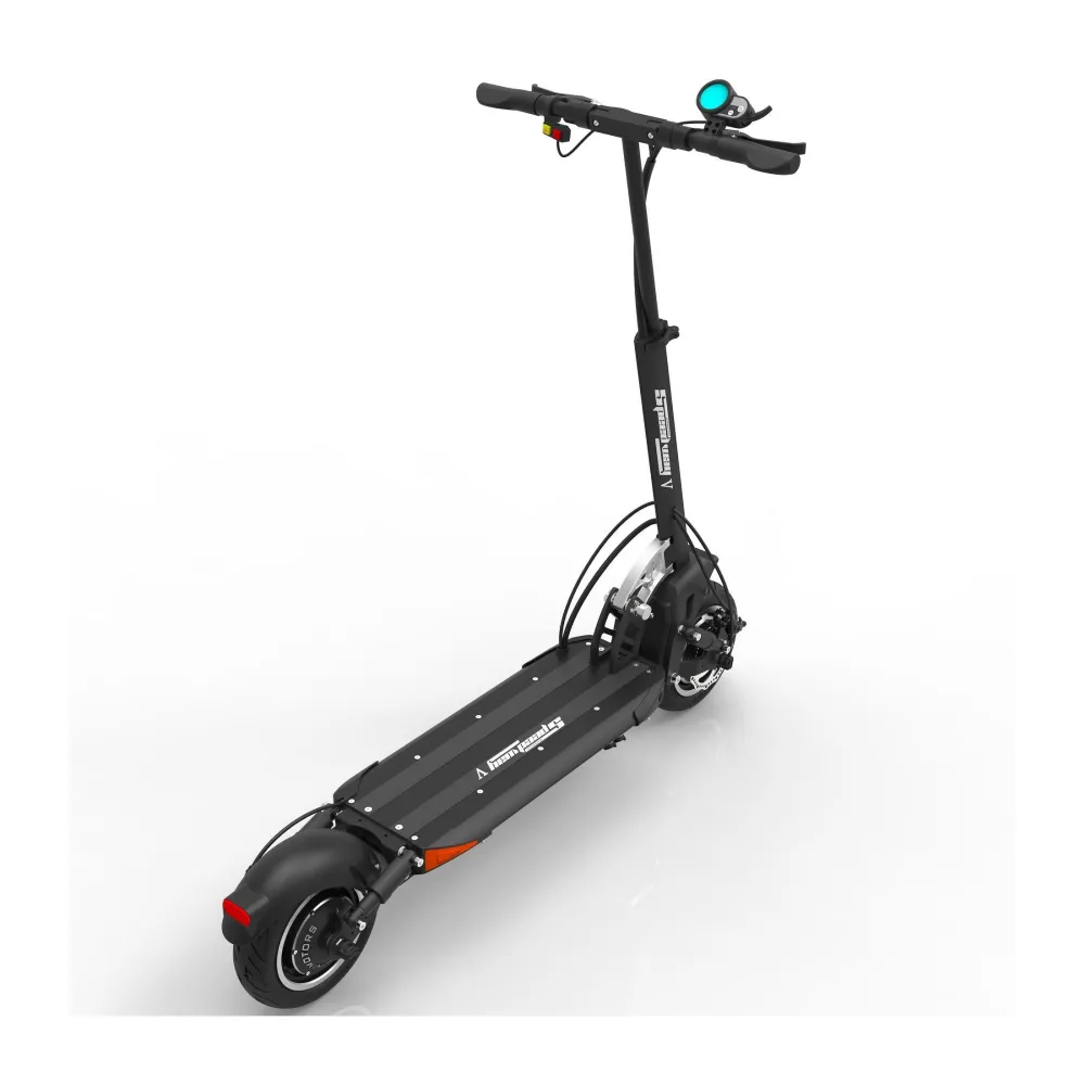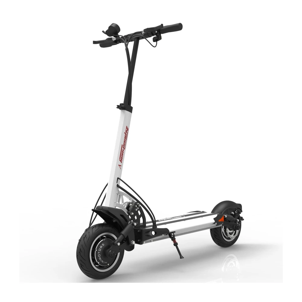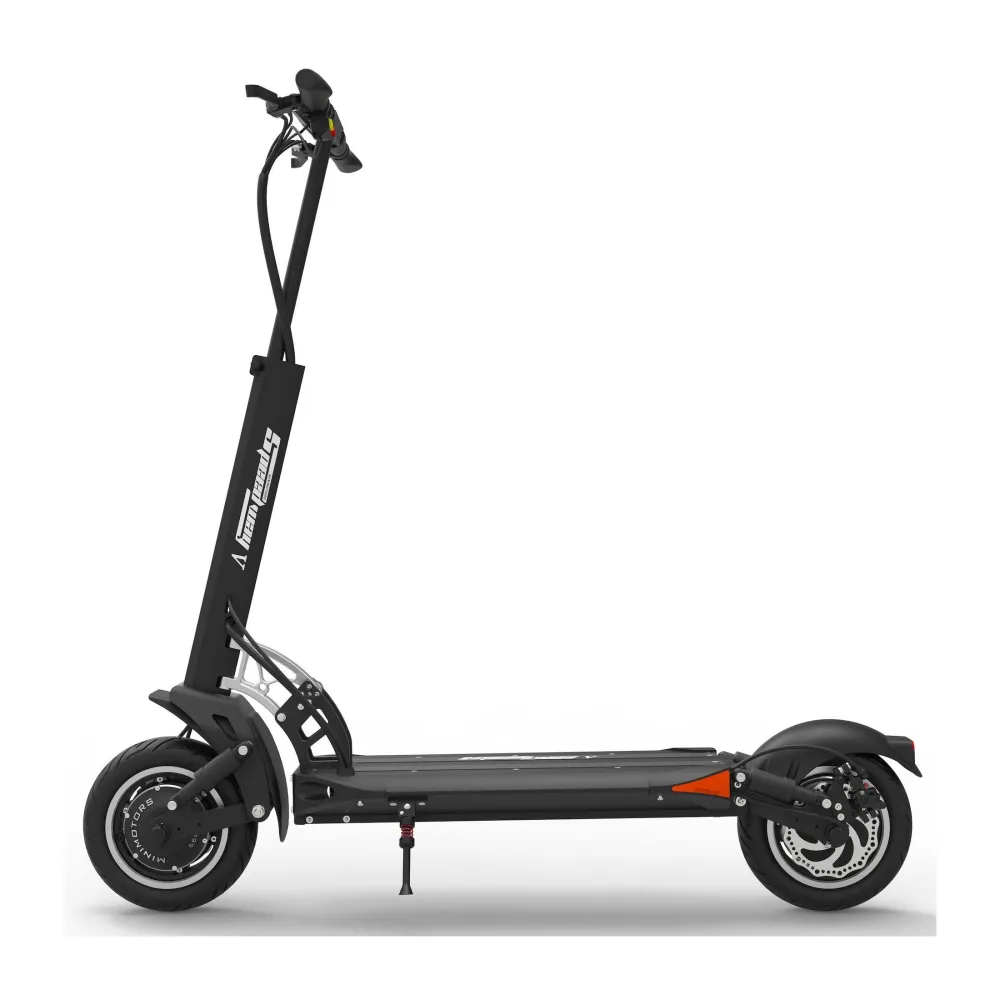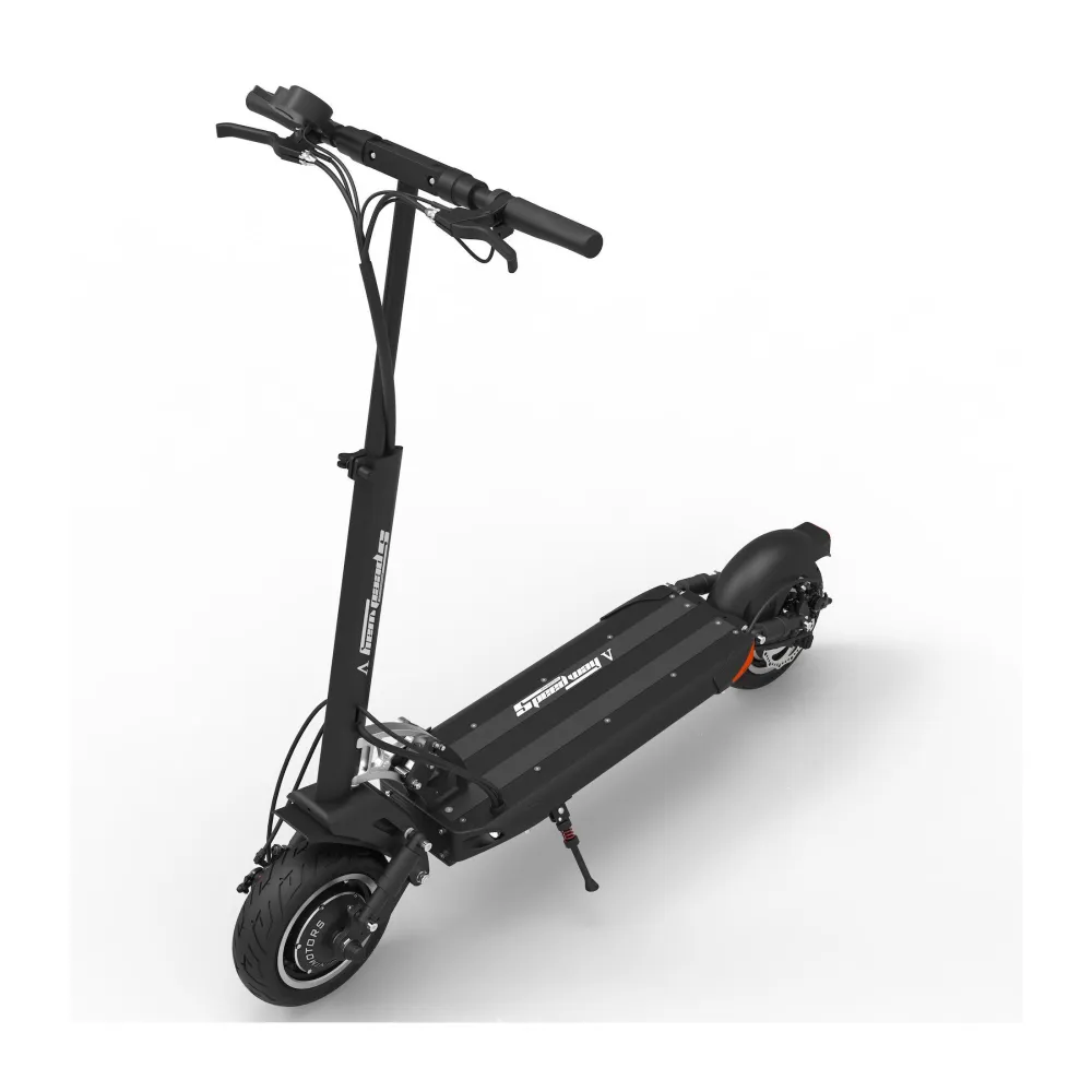 Заявленная максимальная скорость 65 км, это делает самокат скоростным, те кто любит быстрое движение, оценят. Широкие колеса 10 дюймов придают устойчивости и уверенности в повороте, на каждое колесо предусмотрен дисковый тормоз, есть функция рекуперации, ABS система.